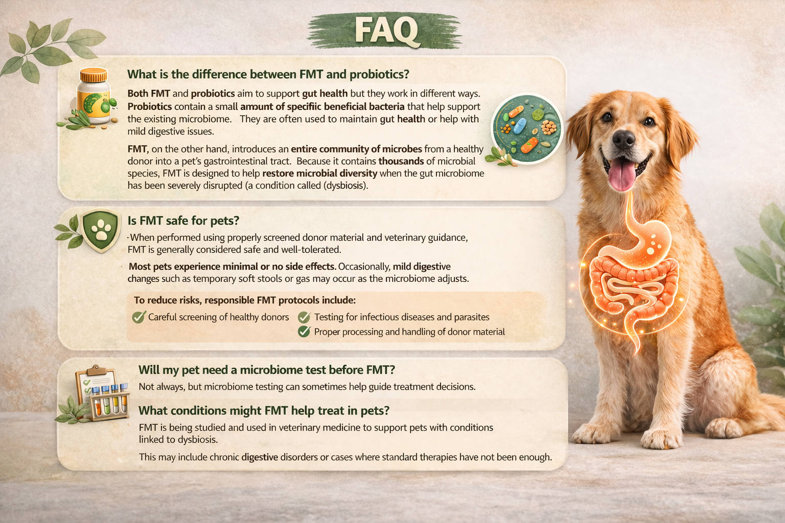 In more severe cases of dysbiosis, veterinarians may consider faecal microbiota transplantation (FMT). FMT might sound unusual, but it’s rooted in a simple idea: restore balance in the gut by introducing beneficial microbes from a healthy donor into a sick animal’s gut. Unlike standard probiotics that contain only a few strains, FMT delivers a whole community of microbes, helping to replace missing or low quantity bacteria and crowd out harmful ones. FMT involves transferring carefully screened healthy donor microbiota into the recipient’s gastrointestinal tract, and is done via two main ways: